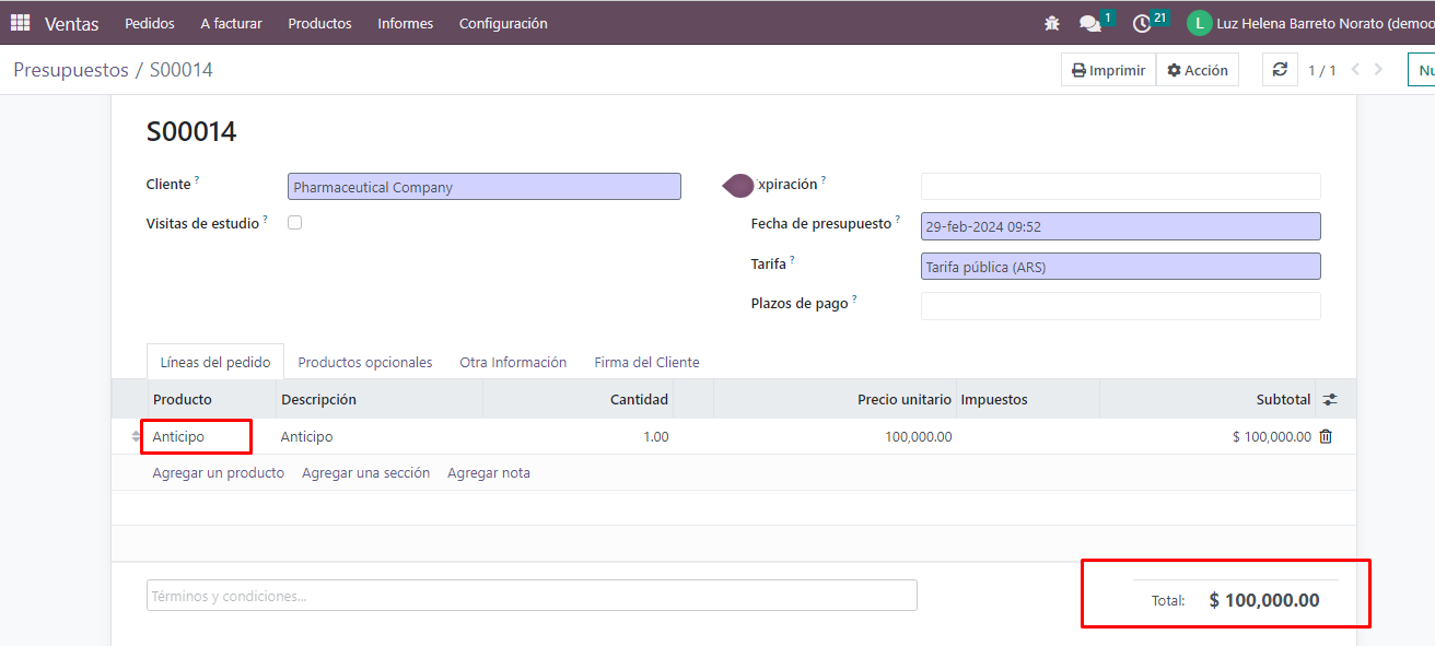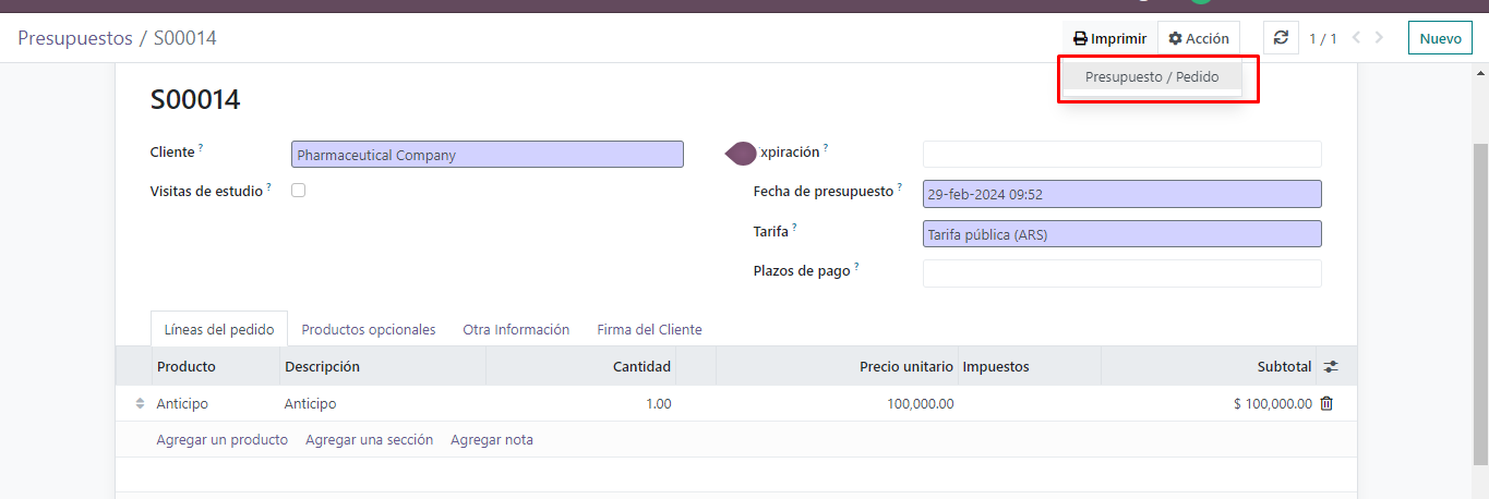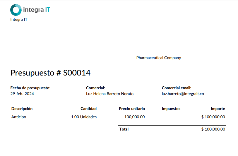 Es posible crear el anticipo que se cobra al sponsor en el módulo de ventas / pedidos / presupuestos