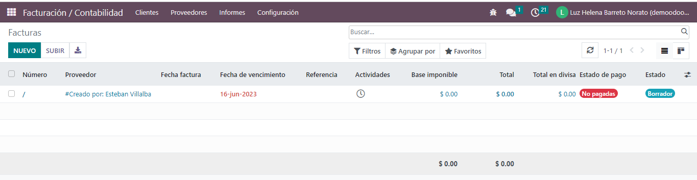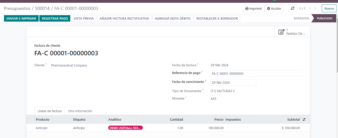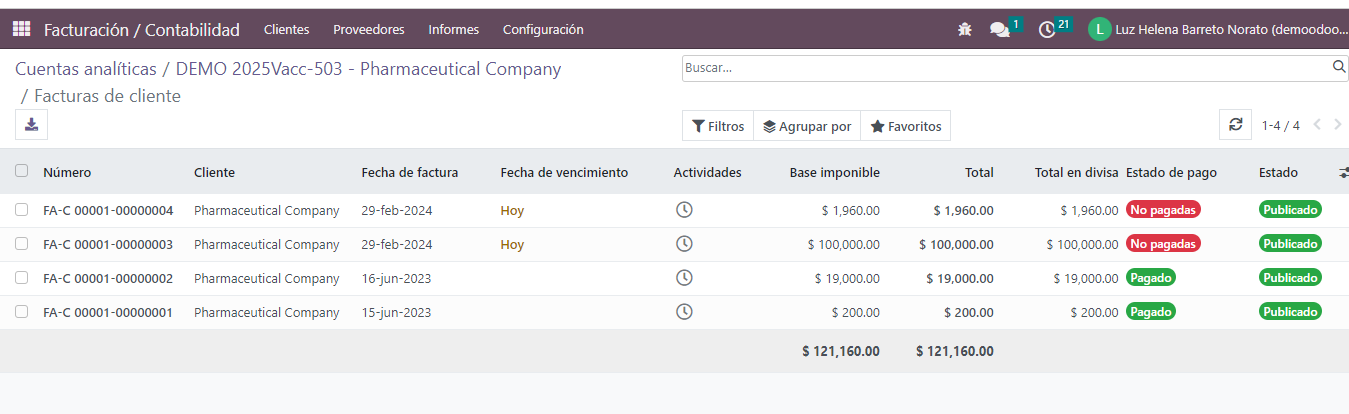 Es decir desde la cuenta analítica se puede ver todo lo que se ha facturado del estudio. Es posible ver y registrar facturas pagadas, no pagadas o pagadas parcialmente.