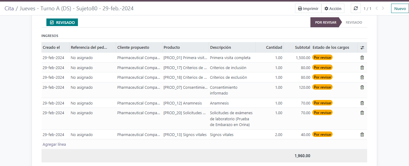 Al ejecutar una visita, en el momento en que la cita cambia a estado DIGITADO CRF, los cargos de la visita se generan de forma automática para revisión: