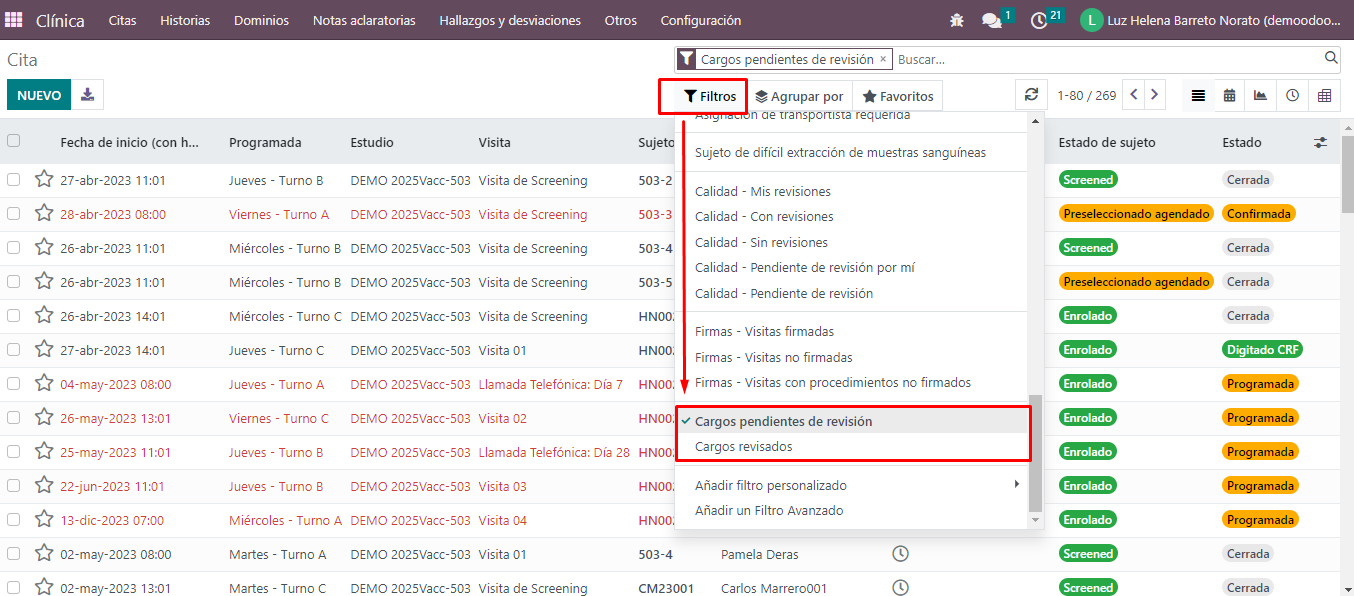 Es posible filtrar las visitas que tienen cargos revisados y cargos por revisar.