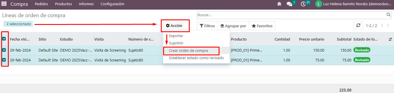 Se seleccionan las líneas / botón acción / crear orden de compra