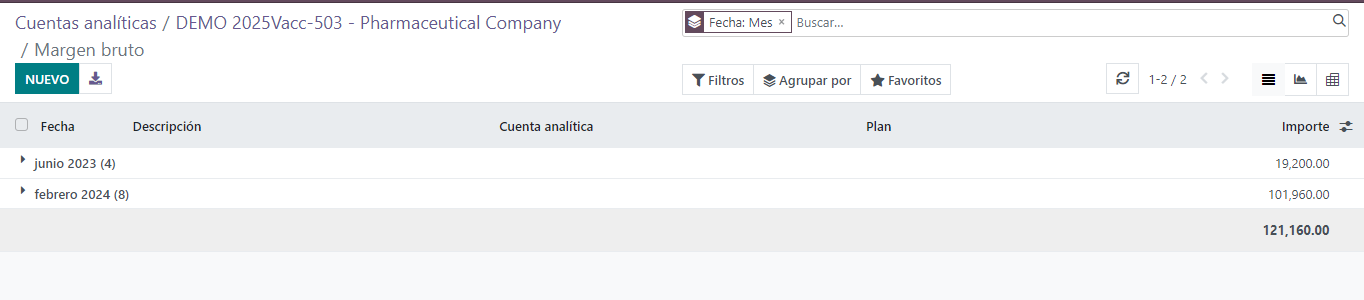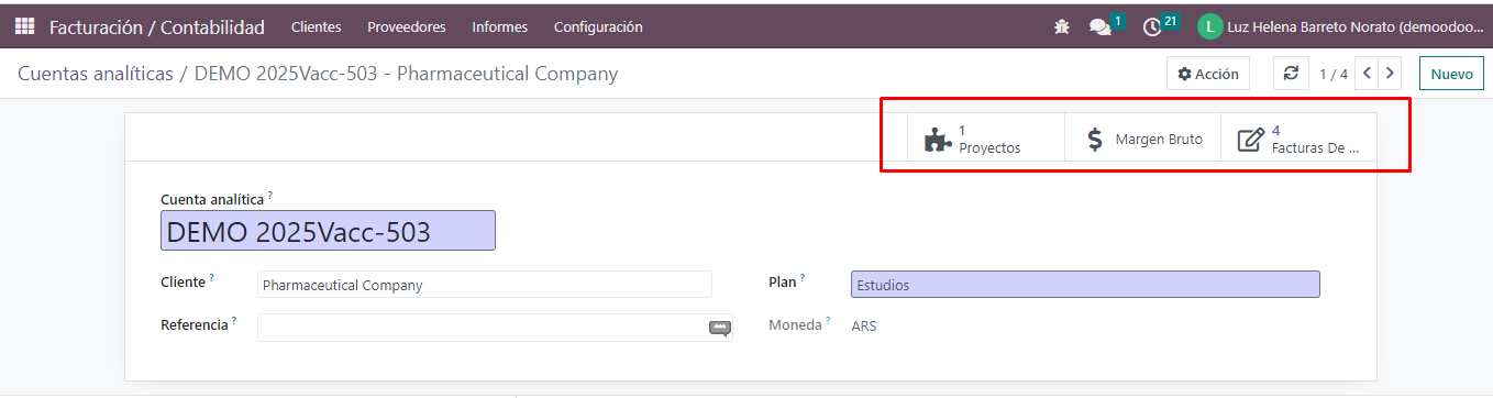 b. El estado del proyecto tambien se puede ver desde el módulo de FACTURACIÓN / CONTABILIDAD, entrando a la cuenta analítica, en donde se puede ver el proyecto, el margen bruto, las facturas de cliente, facturas de proveedores, pedidos de compra.