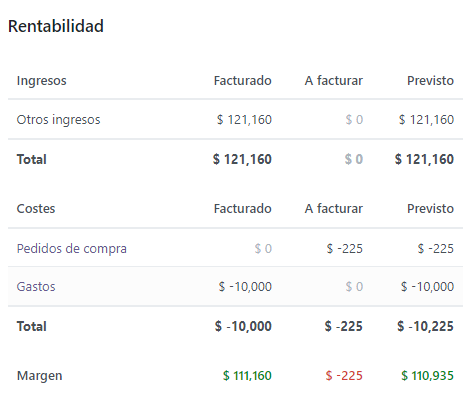 a. En actualizaciones del proyecto, muestra la rentabilidad del proyecto: Ingresos, gastos, margen