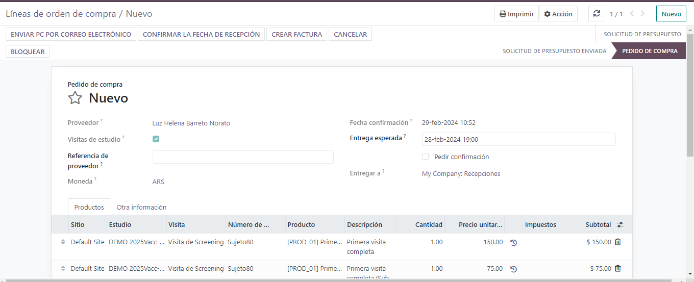Se selecciona el proveedor al que le voy a pagar, puedo crear la orden de compra y confirmar el pedido