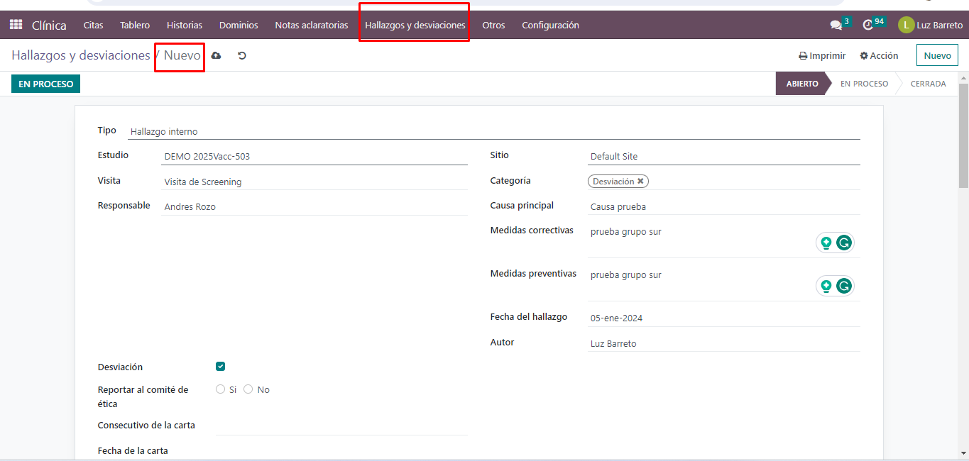 En Trial 360 contamos con el módulo de hallazgos y desviaciones, en este un usuario con permisos puede crear un hallazgo, registrando entre otras cosas: el tipo de hallazgo, su responsable, categoría, causa, las medidas correctivas y preventivas, criticidad, sujetos relacionados, si se trata de una desviación: reporte a comite de ética, es posible relacionar las visitas, eventos adversos, estudios de laboratorio o revisiones de calidad que haya lugar.