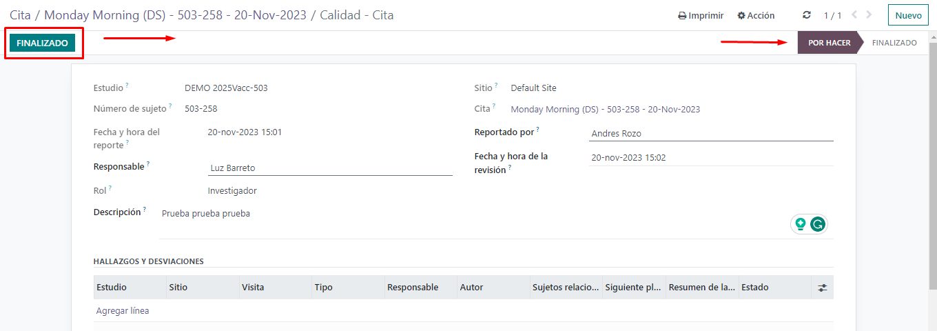 Supervise cómodamente el estado de la revisión a través de la barra superior, donde los indicadores "por hacer", "pendiente" o "finalizada" ofrecen una visión clara.