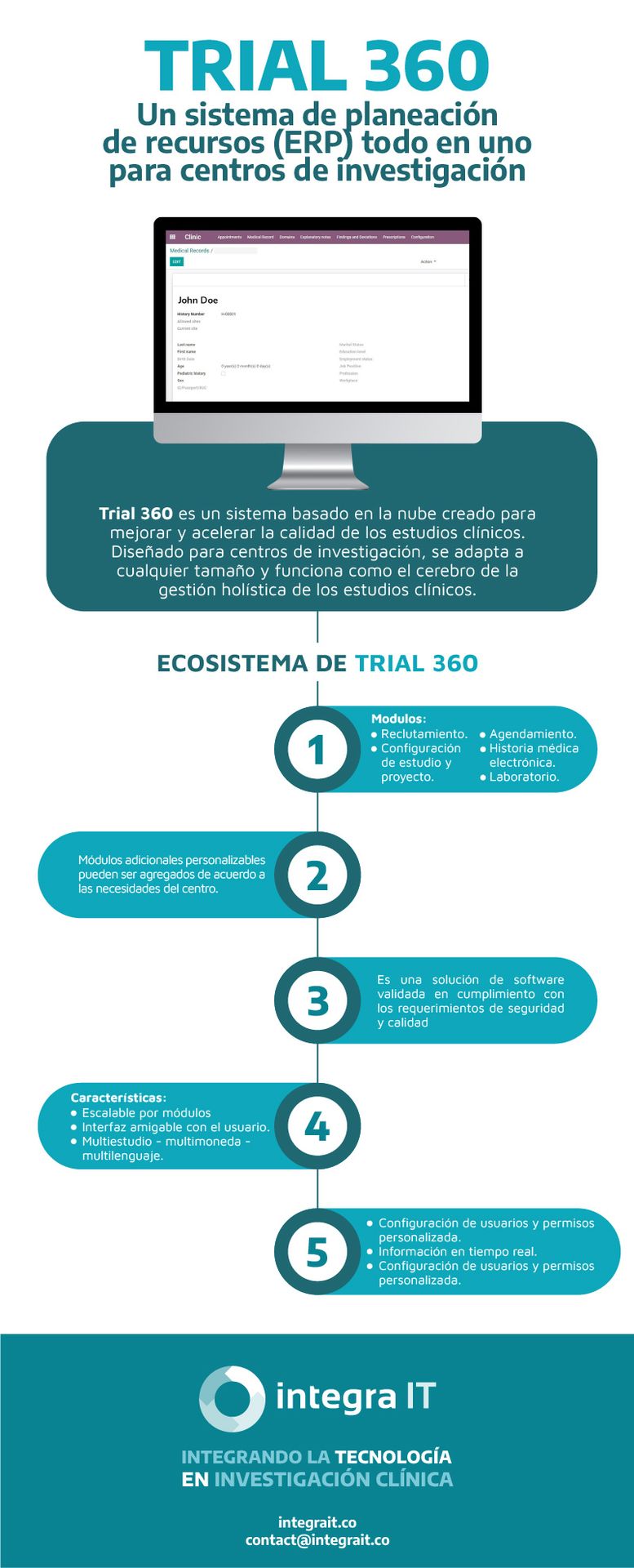 Los centros de investigación en países emergentes enfrentar retos todos los días. Por esto, inspirados en una red de centros real en América Latina, hemos creado la solución Trial360, un sistema de planeación de recursos (ERP) que apoya la ejecución de estudios clínicos y sus actividades propias (reclutamiento, laboratorios, etc.), así como las operaciones normales de cualquier centro, como finanzas, recursos humanos, e-learning, etc.